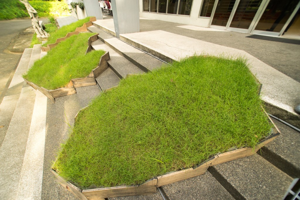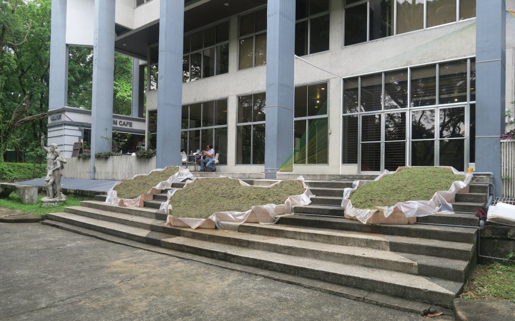 A grass installation modelled after three islands just off the Muara shoreline. The location of Pulau Besar on the steps leading up to the main entrance of the Vargas Museum creates a contradiction as its location on the steps symbolises progress and growth yet the grass islands deliberately creates an obstruction of the visitors’ pathway up and down the steps.