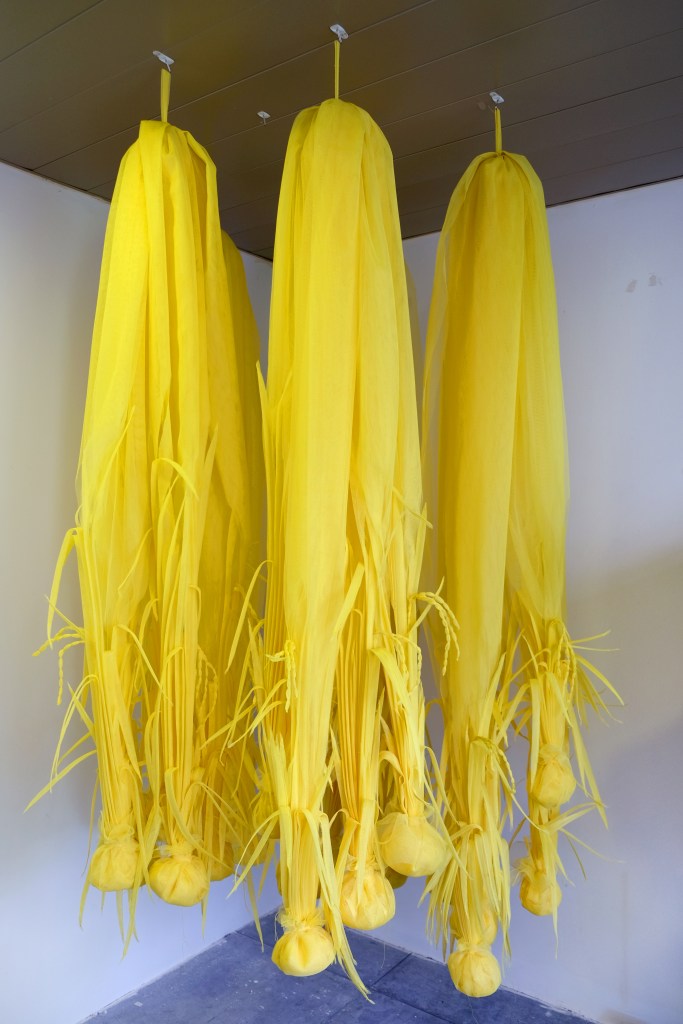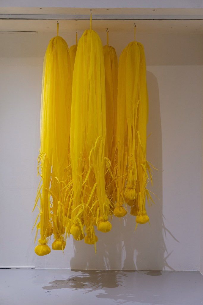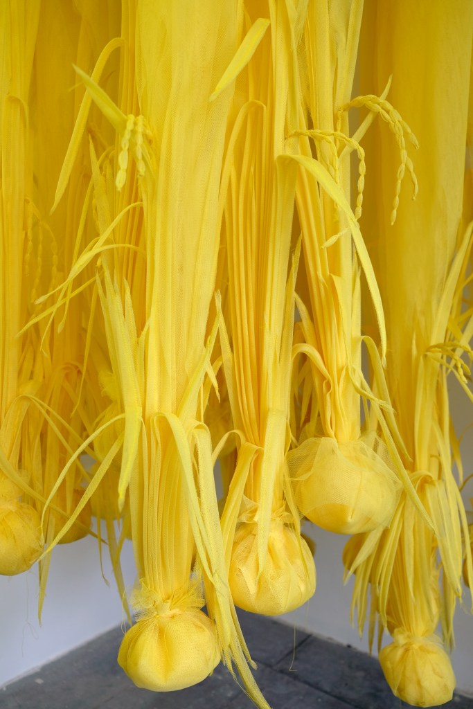 A sense of displacement is communicated through a plot of a padi (rice) field made out of netting. The subtle organic colour of the net, translucency and the lightness of material (as a sculpture) communicates the idea of convenient logistics and a sense that it is on a continuous voyage.