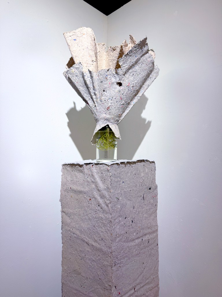 Nostalgia upon returning to a space is often quietly overwhelming. People revisit places in the hope of revisiting a moment. Akar 01 prompts conversations around why such large spaces can feel so overwhelmingly small, or how such an unremarkable space can feel so full. The bouquet in Akar 01 rests upon a tall grey papier-mâché plinth that resembles cold concrete, though it is fragile enough to be destroyed by water. The use of a living plant, rather than a fading one, signifies memories that remain present and active within us, set against a physical space that has long forgotten our presence.