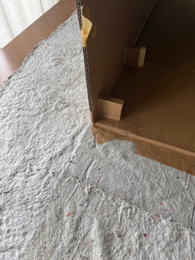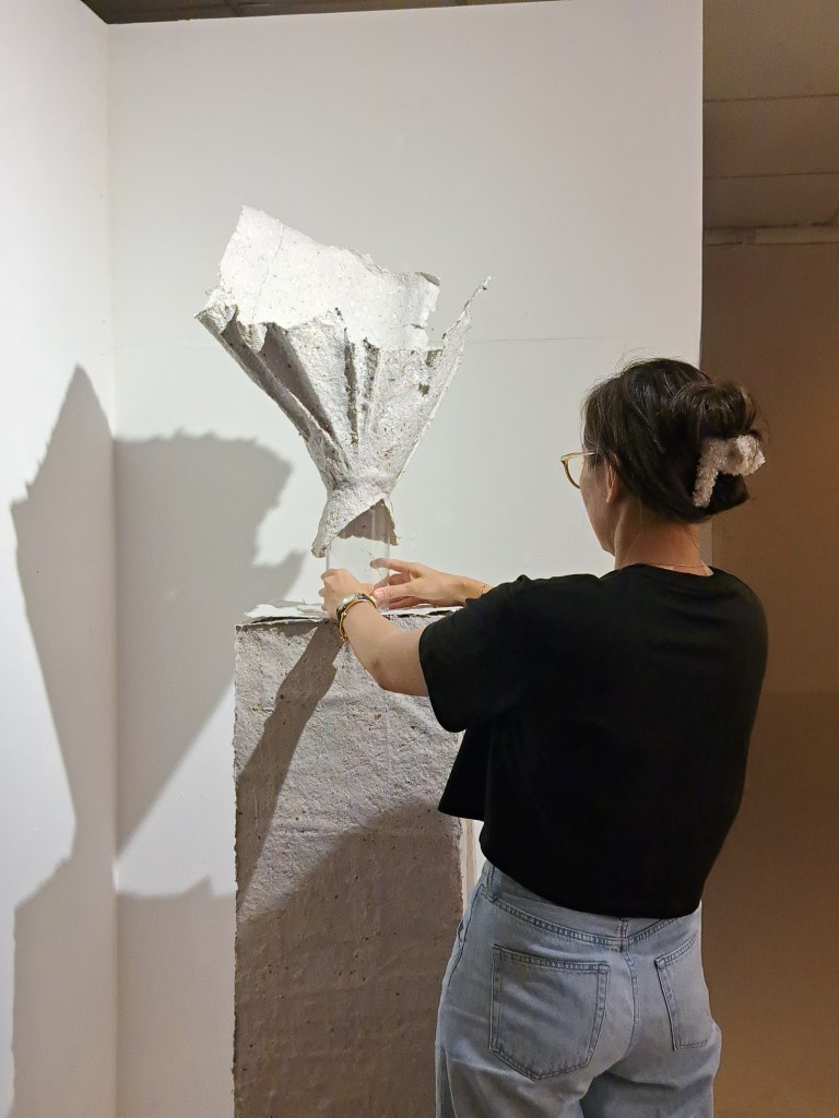 Every element in the installation of the artwork was upcycled from items from the artist’s own home. The papier-mâché was upcycled from the artist’s own sketchbooks and diaries.